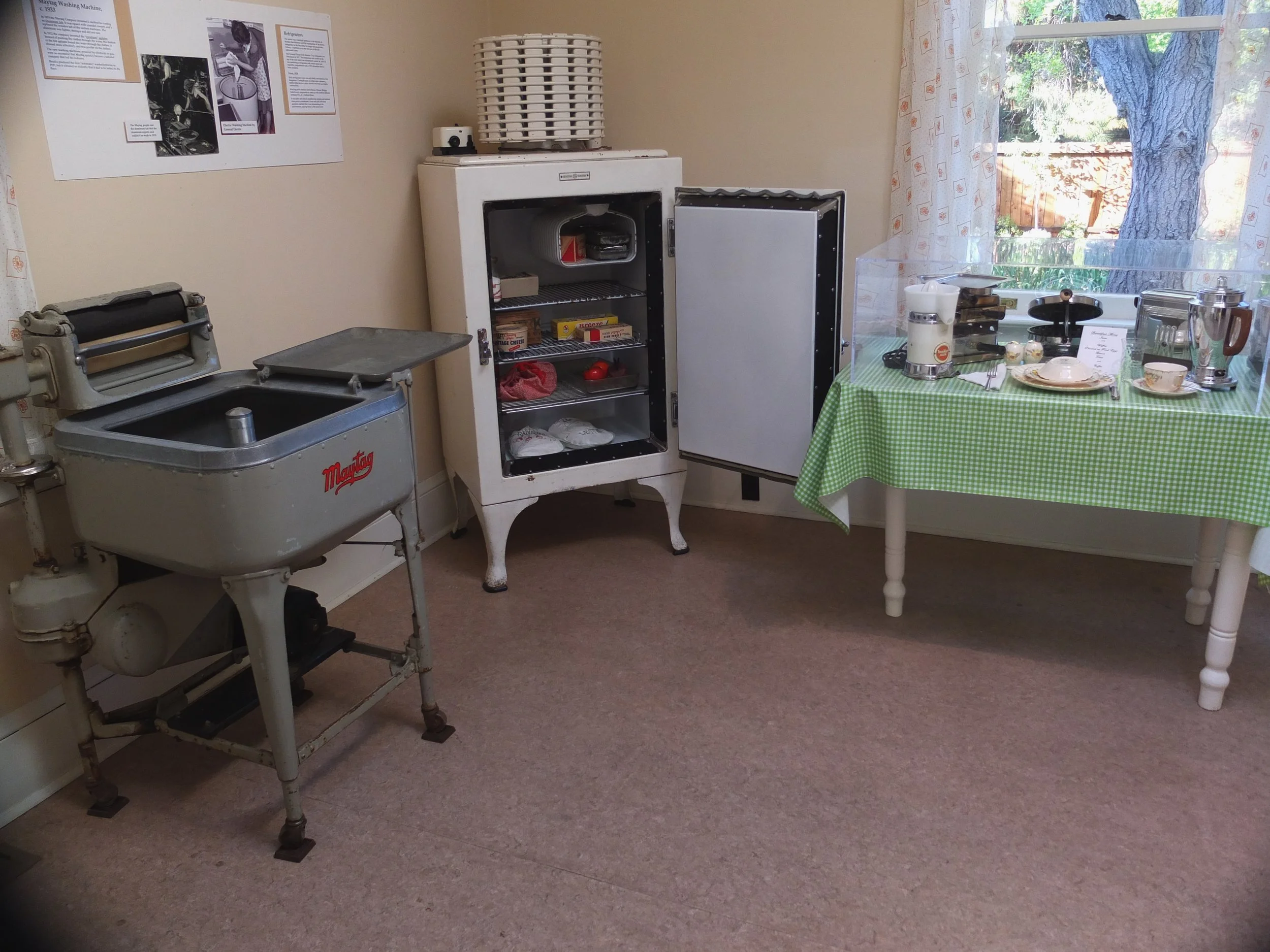 The Williams House kitchen exhibit showcases a variety of domestic technologies from the early 20th century, ranging from a Hoosier cabinet to a 1930s monitor top refrigerator. It currently features a "modern" 1930s kitchen with the latest gadgets and decor.